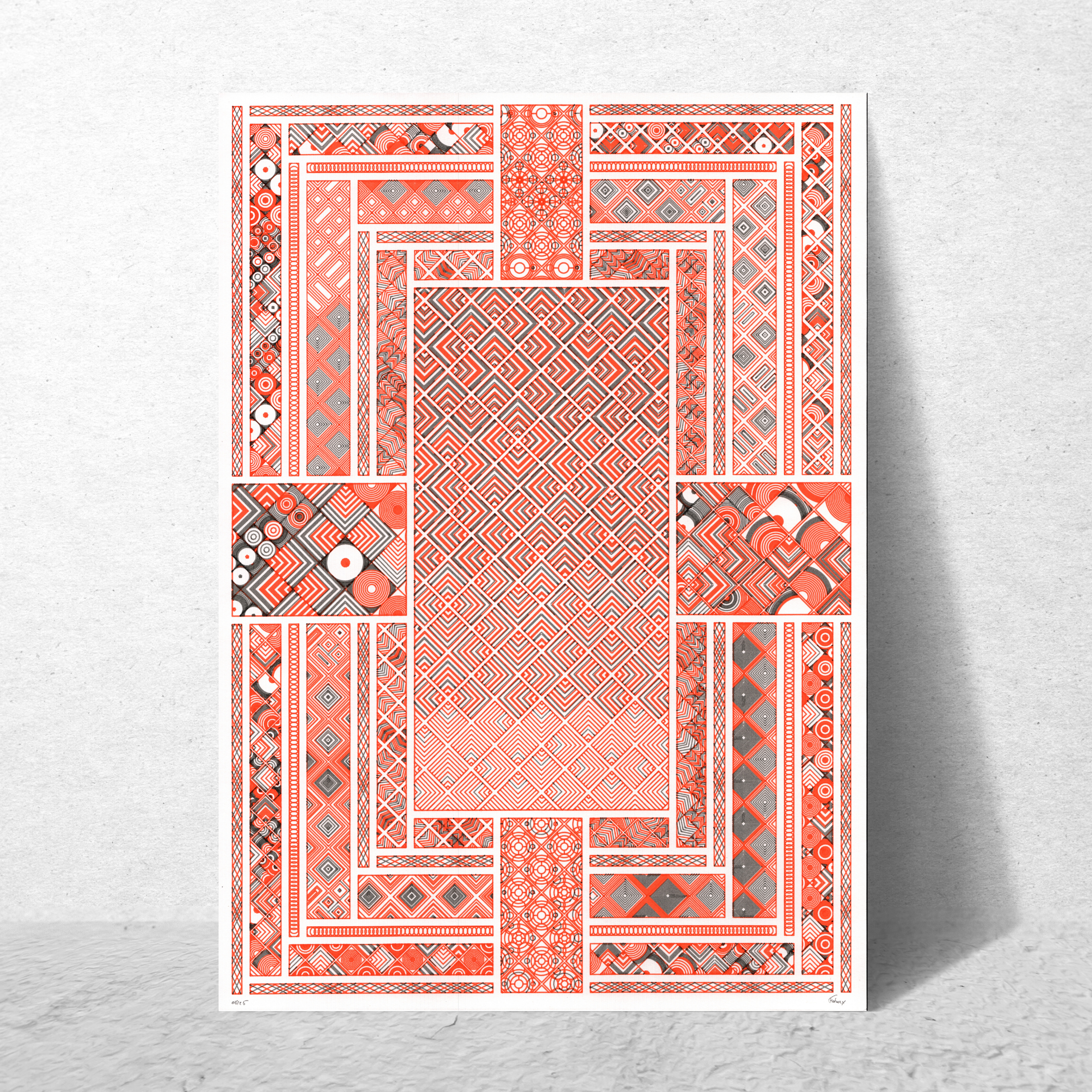 This A3 plot features "Ornamental plot", a generative art piece written in javascript. It puts together various mediterranean patterns ( with a twist ) into a patchwork composition. The end result is a carefully structured chaos of pieces that should not belong together, yet produce a cohesive piece.